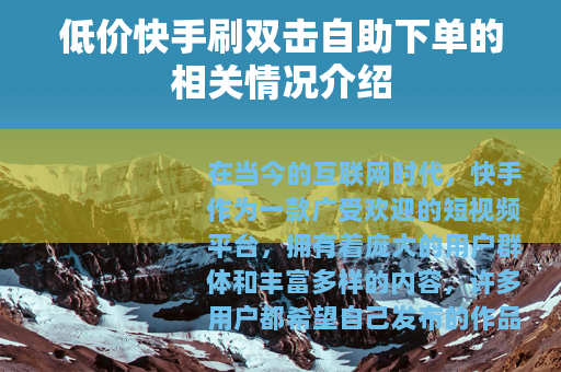 在当今的互联网时代,快手作为一款广受欢迎的短视频平台,拥有着庞大的用户群体和丰富多样的内容,许多用户都希望自己发布的作品能够获得更多的双击点赞,以提高作品的热度和曝光度,在这样的需求下,低价快手刷双击自助下单的服务应运而生。
