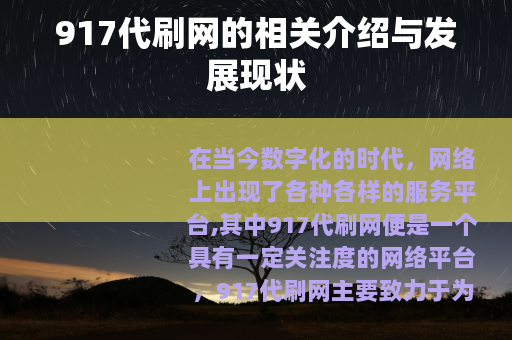 在当今数字化的时代,网络上出现了各种各样的服务平台,其中917代刷网便是一个具有一定关注度的网络平台。