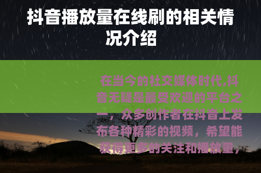 抖音播放量在线刷是一个在抖音发展过程中出现的现象,它既有其存在的一定原因和吸引力,但也存在着诸多问题和风险,创作者们需要在追求播放量和保证作品质量之间找到一个平衡点,以一种积极健康的方式在抖音上发展自己的事业,为抖音的生态建设贡献自己的力量,共同推动抖音平台不断向前发展,为社会创造更多的价值和正能量。 对您有所帮助,您可以根据实际需求进行调整修改,再次强调,不建议在实际中进行刷量等违规操作。