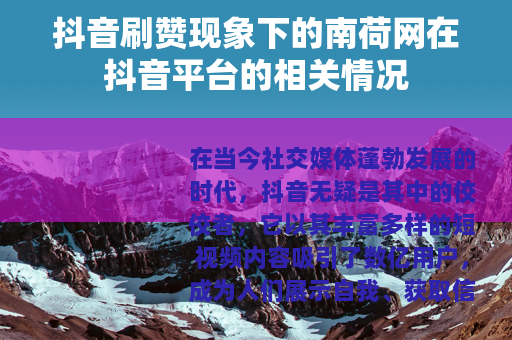 在当今社交媒体蓬勃发展的时代,抖音无疑是其中的佼佼者,它以其丰富多样的短视频内容吸引了数亿用户,成为人们展示自我、获取信息和娱乐消遣的重要平台,而在抖音的生态中,出现了一种现象,那就是抖音刷赞,与之相关的还有像南荷网这样的平台。