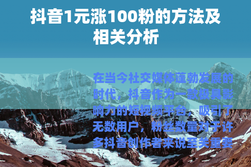 在当今社交媒体蓬勃发展的时代,抖音作为一款极具影响力的短视频平台,吸引了无数用户,粉丝数量对于许多抖音创作者来说至关重要,它不仅代表着个人的影响力,还可能带来更多的商业机会和收益,而“抖音1元涨100粉”这样的现象也随之出现,引发了众多关注和讨论。