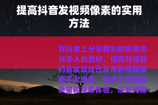 通过以上这些方法,我们可以在抖音发视频时有效地提高视频的像素,让我们的作品更加吸引人,获得更多用户的喜爱和关注,不断优化视频的像素质量,能够为我们在抖音这个充满创意和活力的平台上展现更好的自己和更精彩的内容提供有力支持。