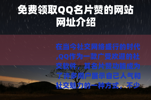 免费领取QQ名片赞的网站网址为广大QQ用户提供了一个增加名片赞数量的便捷途径,通过这些网站,用户可以在不花费太多精力和金钱的情况下,让自己的QQ名片更加出彩,吸引更多好友的关注和点赞,只要用户能够正确选择和合理使用这些网站,就能够在QQ社交世界中展现出自己独特的魅力,享受更加丰富的社交体验。