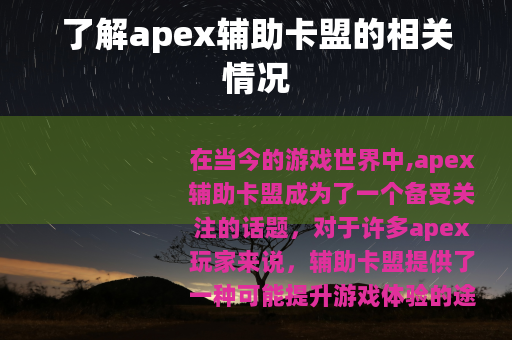 在当今的游戏世界中,apex辅助卡盟成为了一个备受关注的话题,对于许多apex玩家来说,辅助卡盟提供了一种可能提升游戏体验的途径。