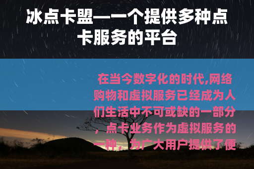 在当今数字化的时代,网络购物和虚拟服务已经成为人们生活中不可或缺的一部分,点卡业务作为虚拟服务的一种,为广大用户提供了便捷的充值方式,满足了他们在游戏、通讯、视频会员等多个领域的需求,冰点卡盟就是这样一个在点卡服务领域颇具影响力的平台。