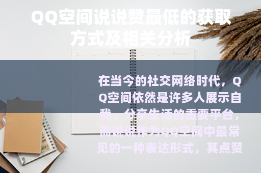 QQ空间说说赞最低的情况是由多种因素共同作用的结果,通过不断优化说说的内容、选择合适的发布时间、积极与好友互动以及合理利用QQ空间的功能等方式,我们可以在一定程度上提高说说赞的最低值,让自己在QQ空间中的表达能够得到更多的关注和认可,但同时,我们也要始终牢记社交的本质是真实和真诚,不要让点赞数量成为我们社交生活的唯一追求,而是要在享受社交网络带来的便利和乐趣的同时,保持一颗平常心,以积极健康的心态面对社交中的各种现象和数据,这样,我们才能在QQ空间中真正实现自我表达和社交互动的双重价值,让我们的社交生活更加丰富多彩。 能为你提供一些关于QQ空间说说赞最低情况的分析和思考,让你在使用QQ空间时能够更加得心应手,更好地与朋友们进行交流和分享,无论是追求高点赞量还是满足于较低的点赞数,最重要的是我们在这个过程中能够收获快乐和有意义的社交体验。