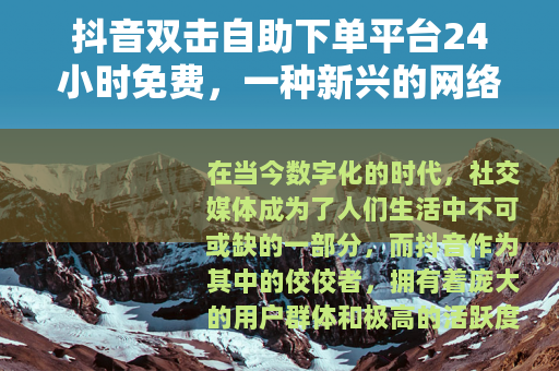 在当今数字化的时代,社交媒体成为了人们生活中不可或缺的一部分,而抖音作为其中的佼佼者,拥有着庞大的用户群体和极高的活跃度,在抖音的世界里,视频的双击点赞数量往往代表着其受欢迎程度和影响力,为了满足用户对于提升视频热度的需求,抖音双击自助下单平台24小时免费应运而生,为众多创作者和用户提供了一种新的助力途径。