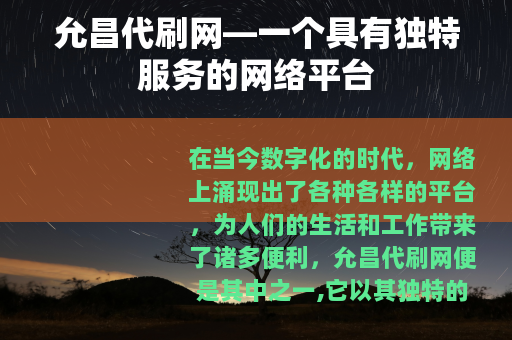 在当今数字化的时代,网络上涌现出了各种各样的平台,为人们的生活和工作带来了诸多便利,允昌代刷网便是其中之一,它以其独特的服务在网络世界中占据了一席之地。