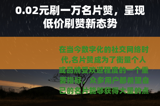 在当今数字化的社交网络时代,名片赞成为了衡量个人或品牌受欢迎程度的一个重要指标,众多用户都希望自己的名片能够获得大量的点赞,以此来展现自己的人气和影响力,而市场上也随之出现了各种各样的刷赞服务,0.02元刷一万名片赞全网最低”的宣传口号格外引人注目。