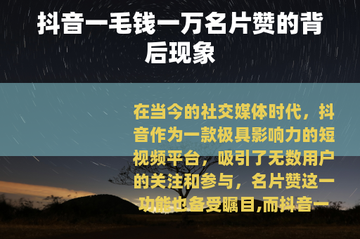 在当今的社交媒体时代,抖音作为一款极具影响力的短视频平台,吸引了无数用户的关注和参与,名片赞这一功能也备受瞩目,而抖音一毛钱一万名片赞的现象更是引发了诸多讨论。