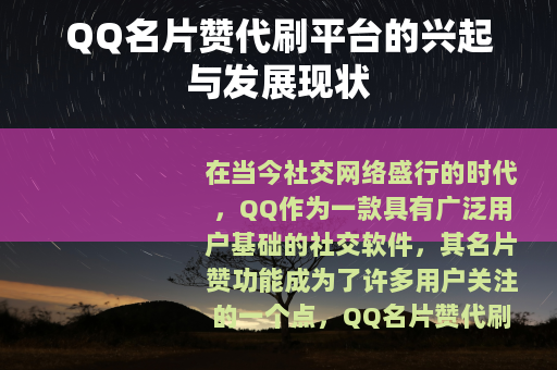 在当今社交网络盛行的时代,QQ作为一款具有广泛用户基础的社交软件,其名片赞功能成为了许多用户关注的一个点,QQ名片赞代刷平台也随之应运而生,并且在网络世界中逐渐形成了一定的规模和影响力。