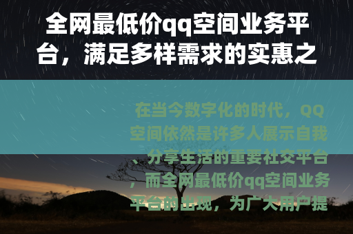 在当今数字化的时代,QQ空间依然是许多人展示自我、分享生活的重要社交平台,而全网最低价qq空间业务平台的出现,为广大用户提供了丰富多样且价格实惠的业务服务,让用户能够以更低的成本打造个性化的QQ空间。