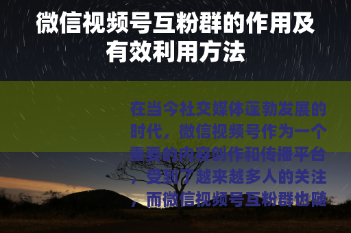 在当今社交媒体蓬勃发展的时代,微信视频号作为一个重要的内容创作和传播平台,受到了越来越多人的关注,而微信视频号互粉群也随之应运而生,成为了许多视频号创作者们交流和互助的重要场所。