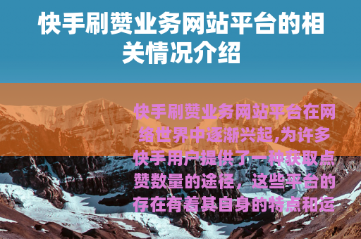 快手刷赞业务网站平台作为短视频行业发展过程中的一个特殊现象,在当前的网络环境中具有一定的市场需求和发展空间,它通过为用户提供点赞等数据提升服务,满足了用户在快手平台上获取更多关注和流量的需求,在一定程度上推动了用户的创作积极性和作品的传播,它也需要面对来自快手平台监测、市场竞争、技术更新以及社会监管等多方面的压力和挑战,在未来的发展中,快手刷赞业务网站平台需要不断探索和创新,在技术、服务、管理等方面不断提升自身的能力和水平,以适应不断变化的市场环境和用户需求,也要注重合法合规经营,积极履行社会责任,与快手平台和其他相关方共同努力,营造一个健康、有序、繁荣的短视频生态环境,实现自身的可持续发展和社会价值的最大化。