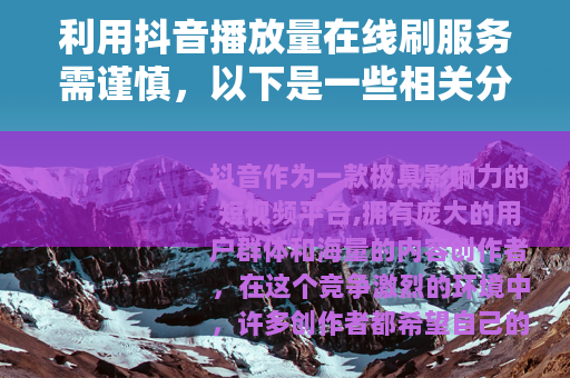 抖音作为一款极具影响力的短视频平台,拥有庞大的用户群体和海量的内容创作者,在这个竞争激烈的环境中,许多创作者都希望自己的作品能够获得更多的关注和播放量,从而提升自己在平台上的影响力和知名度,而抖音播放量在线刷的服务便应运而生。