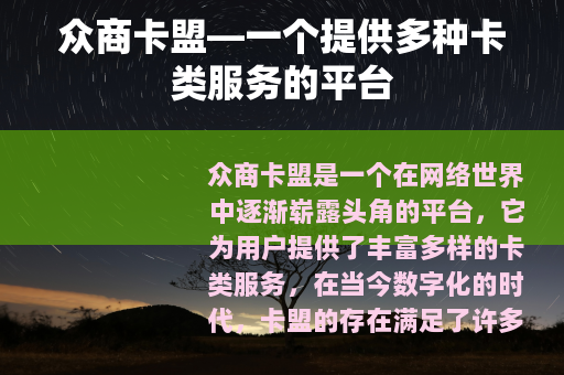 众商卡盟是一个在网络世界中逐渐崭露头角的平台,它为用户提供了丰富多样的卡类服务,在当今数字化的时代,卡盟的存在满足了许多人的不同需求,众商卡盟更是凭借其自身的特点和优势,吸引了众多用户的关注。