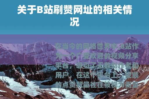 在当今的网络世界中,B站作为一个广受欢迎的视频分享平台,吸引了无数创作者和用户,在这个平台上,视频的点赞数量往往被视为衡量其受欢迎程度和质量的一个重要指标,一些人开始寻找所谓的B站刷赞网址,希望能够通过这种方式来提升自己视频的点赞数,从而获得更多的关注和流量。