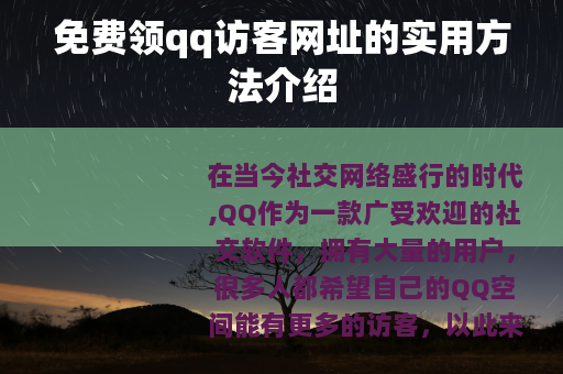 免费领qq访客网址为我们提供了一个增加QQ空间访客量的有效途径,通过合理利用这些网址,并结合自身的努力和技巧,我们可以在社交网络中获得更多的关注和认可,让自己的QQ空间变得更加热闹和有趣,在使用过程中,我们也要保持理性和谨慎,选择正规可靠的平台和方式,避免因为一些不良操作而给自己带来不必要的麻烦,只要我们正确使用免费领qq访客网址,就能在QQ社交领域中取得更好的成绩,让自己的社交生活更加丰富多彩。