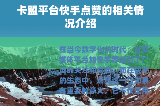 在当今数字化的时代,社交媒体平台如快手等受到了广泛的关注和喜爱,而在快手的生态中,点赞这一行为具有重要的意义,它不仅是用户对优质内容的一种认可和支持方式,也在一定程度上影响着作品的传播和热度,卡盟平台快手点赞也随之应运而生,成为了一个值得探讨的话题。