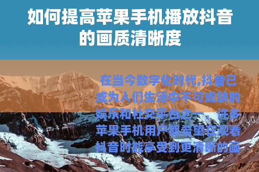 在当今数字化时代,抖音已成为人们生活中不可或缺的娱乐和社交平台之一,许多苹果手机用户都希望在观看抖音时能享受到更清晰的画质,以获得更好的视觉体验,以下是一些可以提高苹果手机播放抖音画质清晰度的方法。