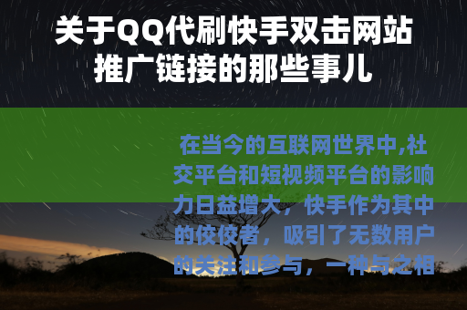 在当今的互联网世界中,社交平台和短视频平台的影响力日益增大,快手作为其中的佼佼者,吸引了无数用户的关注和参与,一种与之相关的现象也逐渐兴起,那就是QQ代刷快手双击网站推广链接。