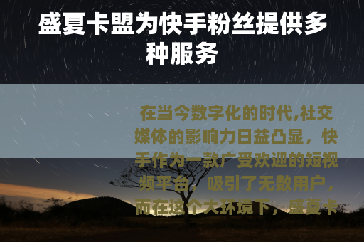 在当今数字化的时代,社交媒体的影响力日益凸显,快手作为一款广受欢迎的短视频平台,吸引了无数用户,而在这个大环境下,盛夏卡盟以其独特的服务在快手粉丝领域崭露头角。