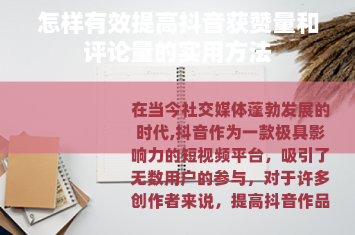 在当今社交媒体蓬勃发展的时代,抖音作为一款极具影响力的短视频平台,吸引了无数用户的参与,对于许多创作者来说,提高抖音作品的获赞量和评论量是他们不断追求的目标,怎样才能实现这一目标呢?以下是一些实用的方法。 质量是关键,要确保你的视频内容具有独特性和吸引力,可以从自身的兴趣爱好、专业技能或生活中的有趣经历出发,创作一些能够引起观众共鸣的视频,如果你擅长烹饪,那么可以制作一系列精美的美食制作视频,详细展示烹饪过程和独特的配方,让观众在观看后不仅能够学到新知识,还能感受到美食的魅力,从而更愿意点赞和评论。