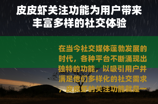 在当今社交媒体蓬勃发展的时代,各种平台不断涌现出独特的功能,以吸引用户并满足他们多样化的社交需求,皮皮虾的关注功能就是一个备受瞩目的亮点,它为用户开启了一扇通往丰富多彩社交世界的大门。