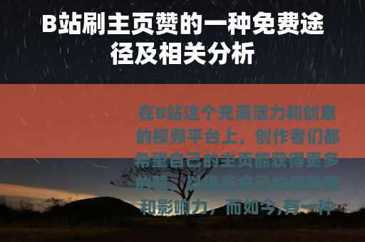 在B站这个充满活力和创意的视频平台上,创作者们都希望自己的主页能获得更多的赞,以提高自己的知名度和影响力,而如今,有一种免费刷B站主页赞的方式逐渐受到了一些人的关注。