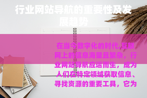 在当今数字化的时代,互联网上的信息海量且繁杂,行业网站导航应运而生,成为人们在特定领域获取信息、寻找资源的重要工具,它为用户提供了一个便捷的入口,能够帮助用户快速定位到自己所需的行业相关网站,节省了大量的时间和精力。