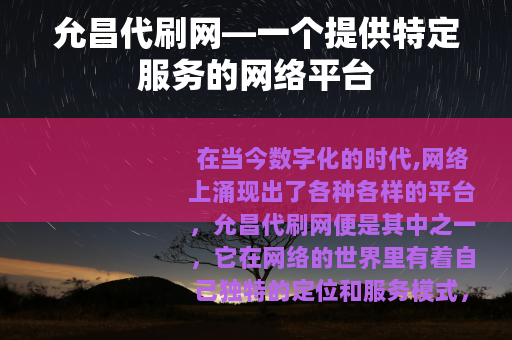 在当今数字化的时代,网络上涌现出了各种各样的平台,允昌代刷网便是其中之一,它在网络的世界里有着自己独特的定位和服务模式,吸引着众多用户的关注。
