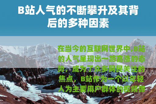 在当今的互联网世界中,B站的人气呈现出一路高涨的态势,成为了众多网民关注的焦点,B站作为一个以年轻人为主要用户群体的视频弹幕网站,其独特的文化氛围和丰富多样的内容吸引了大量的用户,从而积累起了令人瞩目的人气。