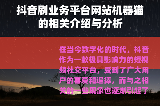 在当今数字化的时代,抖音作为一款极具影响力的短视频社交平台,受到了广大用户的喜爱和追捧,而与之相关的一些现象也逐渐引起了人们的关注,其中就包括抖音刷业务平台网站机器猫。