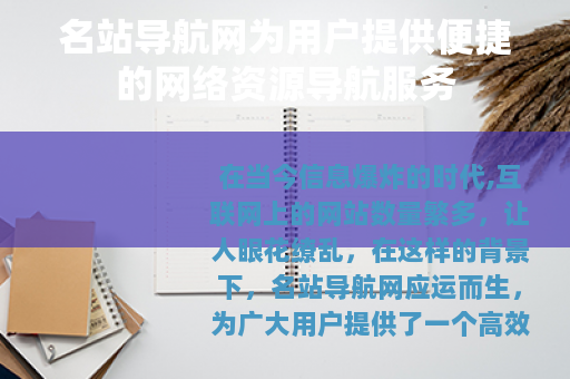 在当今信息爆炸的时代,互联网上的网站数量繁多,让人眼花缭乱,在这样的背景下,名站导航网应运而生,为广大用户提供了一个高效、便捷的网络资源导航平台。