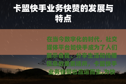 在当今数字化的时代,社交媒体平台如快手成为了人们展示自我、分享生活和传播信息的重要场所,卡盟快手业务快赞也应运而生,为快手用户提供了一种独特的服务体验。