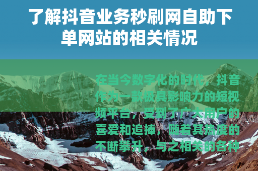 在当今数字化的时代,抖音作为一款极具影响力的短视频平台,受到了广大用户的喜爱和追捧,随着其热度的不断攀升,与之相关的各种业务也应运而生,其中抖音业务秒刷网自助下单网站便是其中之一。