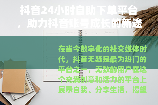 在当今数字化的社交媒体时代,抖音无疑是最为热门的平台之一,无数的用户在这个充满创意和活力的平台上展示自我、分享生活,渴望获得更多的关注和点赞,而抖音24小时自助下单平台的出现,为广大抖音用户提供了一种全新的助力方式。