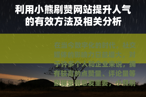 在当今数字化的时代,社交媒体的影响力日益增大,对于许多个人和企业来说,拥有较高的点赞量、评论量等数据变得愈发重要,小熊刷赞网站逐渐进入了人们的视野,为用户提供了一种提升人气的途径。