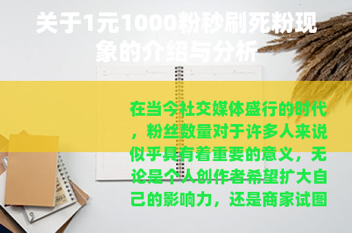 在当今社交媒体盛行的时代,粉丝数量对于许多人来说似乎具有着重要的意义,无论是个人创作者希望扩大自己的影响力,还是商家试图通过社交平台推广产品,粉丝量都被视为一个关键指标,而在这个背景下,一种所谓“1元1000粉秒刷死粉”的现象悄然出现。