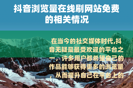 在当今的社交媒体时代,抖音无疑是最受欢迎的平台之一,许多用户都希望自己的作品能够获得更多的浏览量,从而提升自己在平台上的影响力,而抖音浏览量在线刷网站免费这种现象也随之出现。