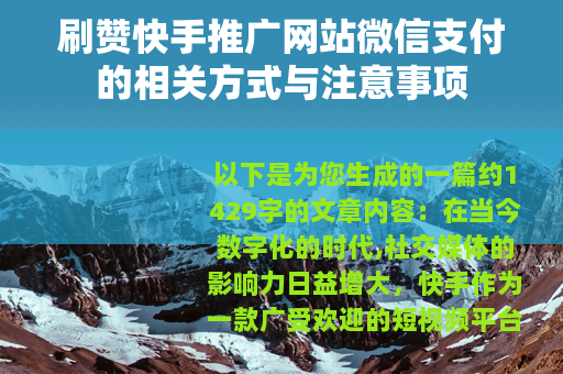 在当今数字化的时代,社交媒体的影响力日益增大,快手作为一款广受欢迎的短视频平台,吸引了无数用户,许多人希望通过各种方式来提升自己在快手上的作品热度,其中刷赞就成为了一种较为常见的手段,而刷赞快手推广网站微信支付也应运而生,为用户提供了一种看似便捷的推广途径。