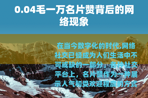 在当今数字化的时代,网络社交已经成为人们生活中不可或缺的一部分,各种社交平台上,名片赞作为一种展示人气和受欢迎程度的方式,受到了许多人的关注,而其中,0.04毛一万名片赞的现象也逐渐在网络世界中兴起,引发了一系列值得探讨的话题。