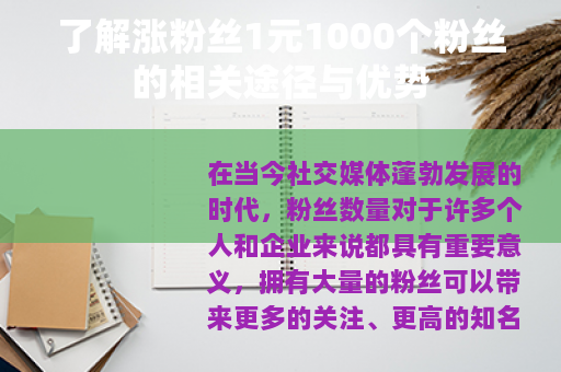 在当今社交媒体蓬勃发展的时代,粉丝数量对于许多个人和企业来说都具有重要意义,拥有大量的粉丝可以带来更多的关注、更高的知名度以及更广阔的发展空间,而“涨粉丝1元1000个粉丝”这样的服务也逐渐进入了人们的视野。