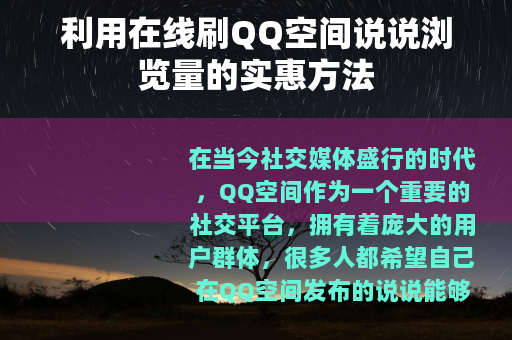 在当今社交媒体盛行的时代,QQ空间作为一个重要的社交平台,拥有着庞大的用户群体,很多人都希望自己在QQ空间发布的说说能够获得更多的浏览量,以此来增加自己的人气和关注度,而在线刷QQ空间说说浏览量因其价格便宜,成为了不少人的选择。