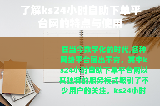 在当今数字化的时代,各种网络平台层出不穷,其中ks24小时自助下单平台网以其独特的服务模式吸引了不少用户的关注。