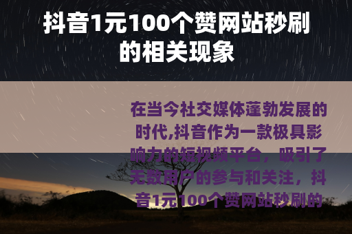在当今社交媒体蓬勃发展的时代,抖音作为一款极具影响力的短视频平台,吸引了无数用户的参与和关注,抖音1元100个赞网站秒刷的现象也逐渐进入了大众的视野。