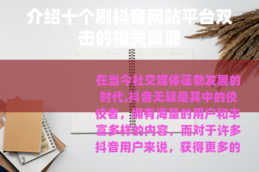 在当今社交媒体蓬勃发展的时代,抖音无疑是其中的佼佼者,拥有海量的用户和丰富多样的内容,而对于许多抖音用户来说,获得更多的双击点赞是他们所期望的,这不仅能带来更多的关注和流量,还能在一定程度上满足用户的成就感,以下将为大家介绍十个与刷抖音网站平台双击相关的资源。