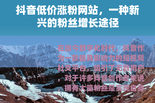 在当今数字化时代,抖音作为一款极具影响力的短视频社交平台,吸引了无数用户,对于许多抖音创作者来说,拥有大量粉丝是实现自身价值和商业变现的重要基础,在这种需求下,抖音低价涨粉网站应运而生,为创作者们提供了一种看似便捷的粉丝增长途径。