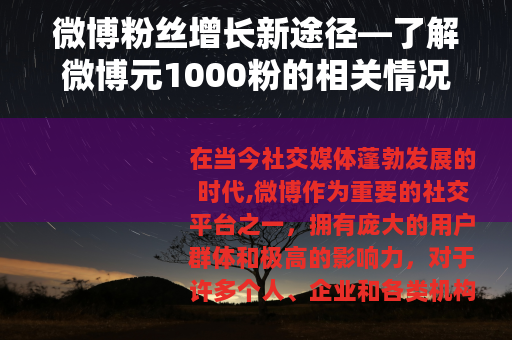 在当今社交媒体蓬勃发展的时代,微博作为重要的社交平台之一,拥有庞大的用户群体和极高的影响力,对于许多个人、企业和各类机构来说,在微博上拥有大量的粉丝是实现信息传播、品牌推广以及与用户互动的关键,而其中,“微博元1000粉”逐渐成为一个备受关注的话题。
