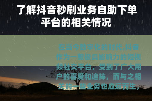在当今数字化的时代,抖音作为一款极具影响力的短视频社交平台,受到了广大用户的喜爱和追捧,而与之相关的一些业务也应运而生,其中就包括抖音秒刷业务自助下单平台。
